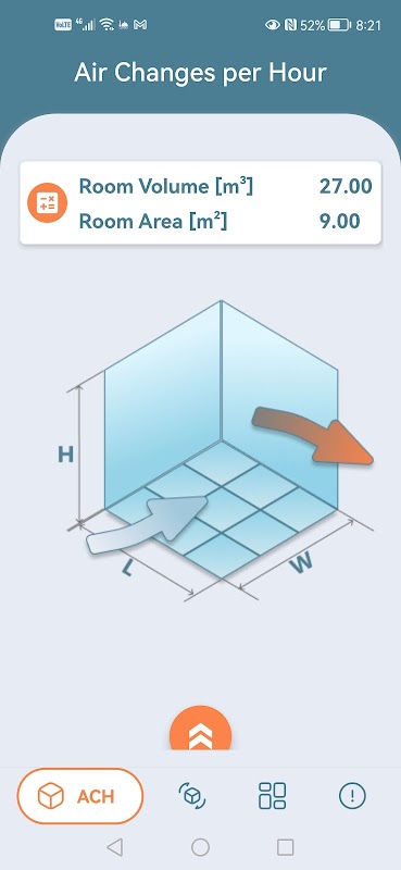 ACH heeft twee hoofdschermen. Het eerste scherm is de Room ACH-tariefcalculator (Air Changes per Hour), waar gebruikers snel en eenvoudig de ACH voor een kamer of ruimte kunnen berekenen. Gebruikers hebben de flexibiliteit om kamerafmetingen, kameroppervlakmodus of kamervolumemodus. Slimme invoervelden geven gebruikers de flexibiliteit om elke vereiste parameter te berekenen, wetende de balansparameters. Op het tweede scherm kan de gebruiker het minimale verse lucht- of afvoerluchtdebiet verkrijgen volgens ANSI/ASHRAE-standaard 62.1-2016, Tabel 6.2.2.1 (voor min. ventilatiesnelheden van verse lucht die vereist zijn in de ademzone) en Tabel 6.5 (voor min. uitlaatgassnelheid). Deze functionaliteit blijkt gunstig voor HVAC-ontwerpers, adviseurs, aannemers en anderen in het veld.