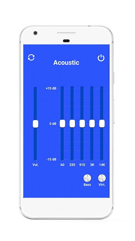 U zult geen moeite niet navigeren op onze app, omdat het slechts bestaat uit een scherm! Alles wat je nodig hebt is er: Virtualizer, basfrequentie, Volume Richter, en de 5-bands equalizer.