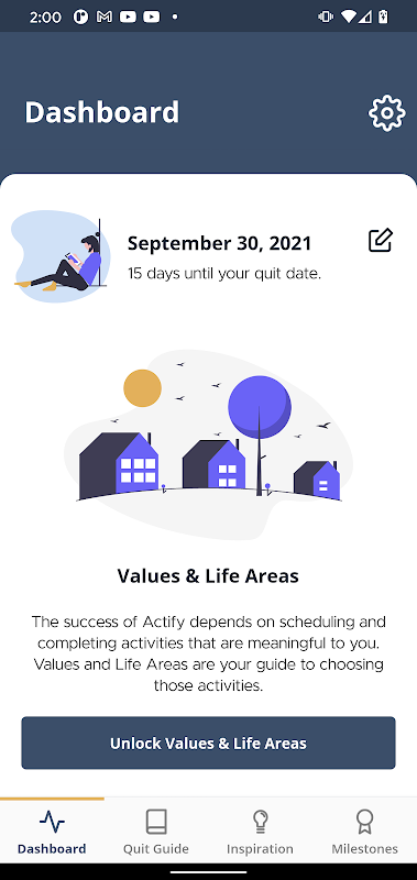 Actify App B gebruikt een aanpak genaamd gedragsactiveringstherapie om u te helpen stoppen met roken. Het helpt u uw persoonlijke waarden te ontdekken, leert u over rooktriggers, helpt u bij het creëren en bijhouden van uw voortgang bij het stoppen met roken en uw activiteiten, en helpt u uw verlangens onder controle te houden. U ontvangt ook meldingen van het programma met nuttige en bemoedigende informatie.