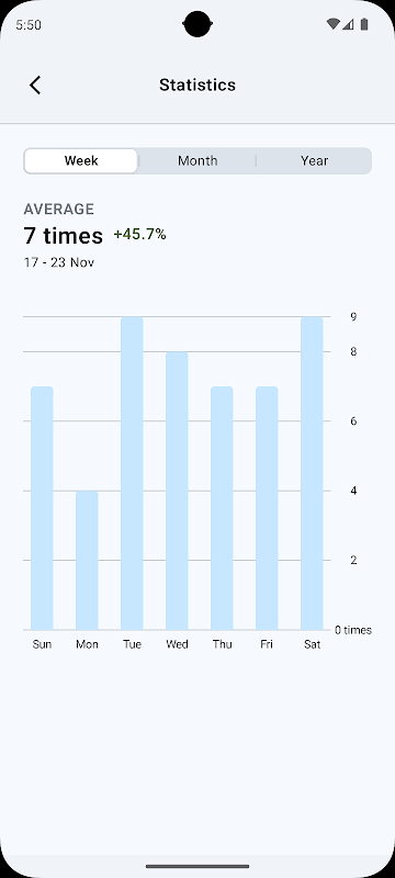 Bekijk dagelijkse, wekelijkse, maandelijkse en jaarlijkse samenvattingen met intuïtieve grafieken en inzichten om datagestuurde verbeteringen in uw routine aan te brengen.