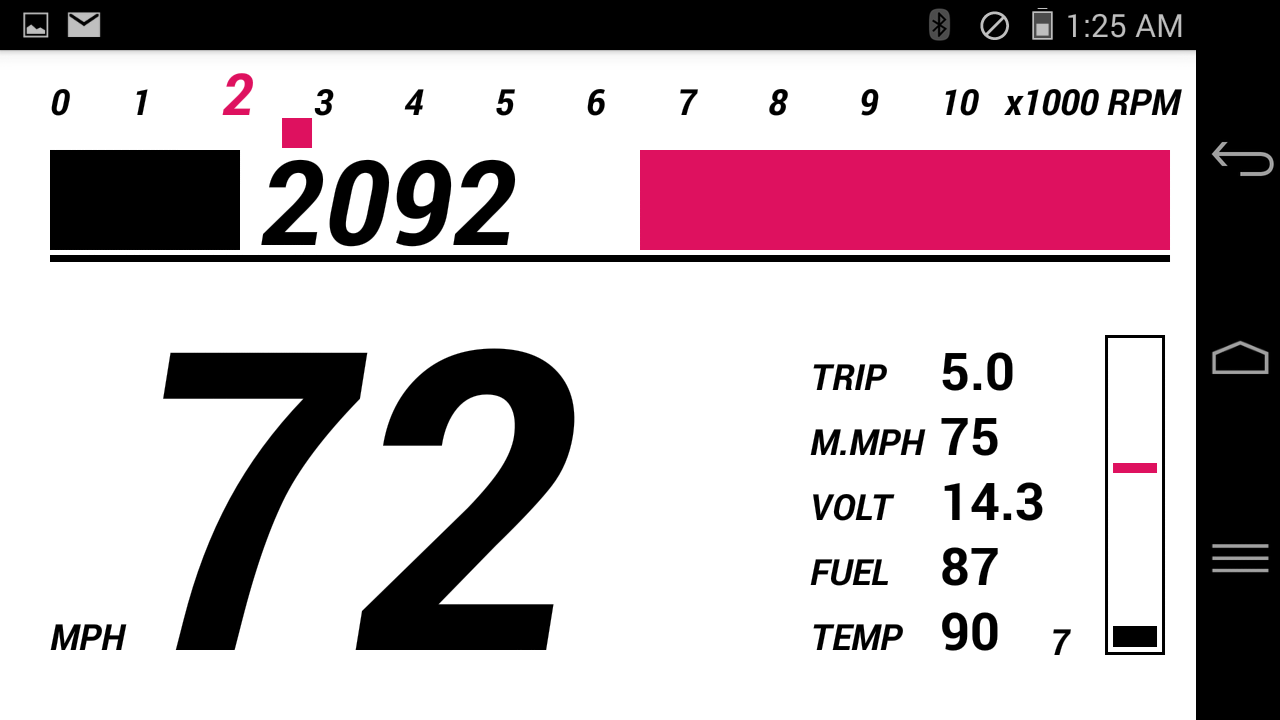 - Verbind en koppel een goedkope Bluetooth ELM327 OBD2, het verandert uw Android-telefoon onmiddellijk in een handig digitaal instrumentenpaneel met het toerental, snelheid, gasklepstand, schakelindicatie, koelvloeistoftemperatuur, spanning in een kleurrijke en gemakkelijk te bekijken lay-out.