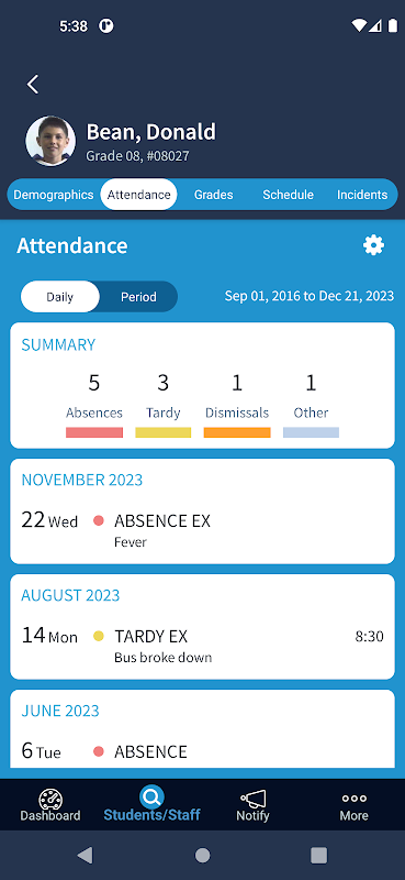 Aanwezigheid: Zie wanneer een student afwezig of te laat is. Bekijk samenvattende totalen en de lijst met gebeurtenissen.