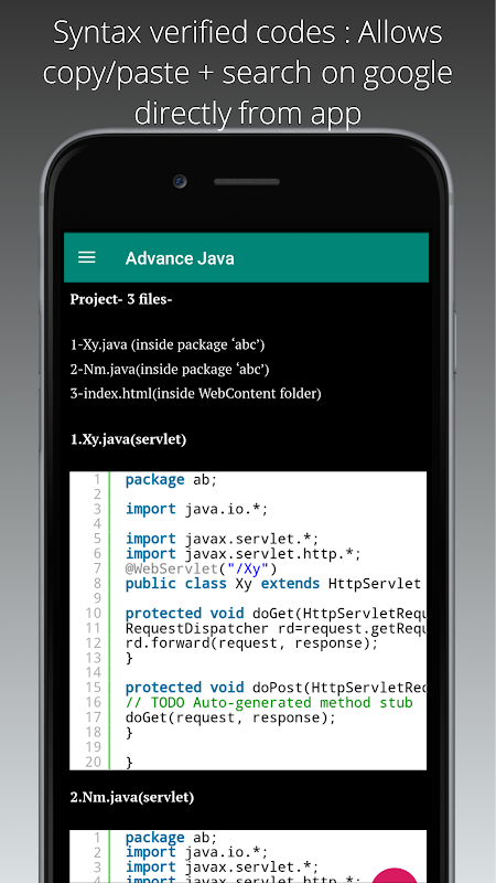 4- Syntax verified codes : allows copy paste, with search on google directly from app