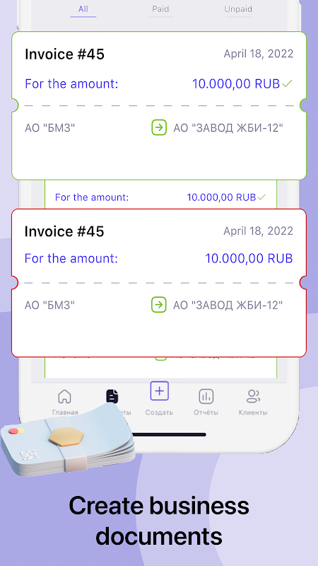 De app functioneert als een organisator van rekeningen. Alle aangemaakte documenten worden hier opgeslagen - facturen, btw-facturen, akten, ontvangstbewijs. Met behulp van het filter kunt u snel degene vinden die u moet bekijken, bewerken of verwijderen. Het is mogelijk om elk document naar een nieuw document te converteren - op basis van de factuur kunt u een akte maken en vice versa. De applicatie is gemaakt volgens zakelijke praktijken en wettelijke vereisten voor facturen en handelingen.