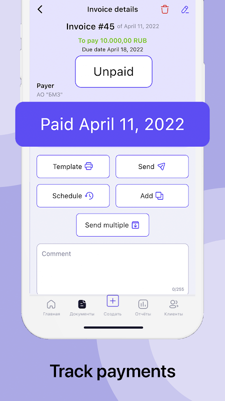 De app helpt om in een paar seconden foutloos het benodigde document te creëren in overeenstemming met de zakelijke documentenstroom. Daarna hoeft u het alleen nog maar per e-mail of in een van de messengers rechtstreeks vanuit de applicatie naar uw klant te sturen.