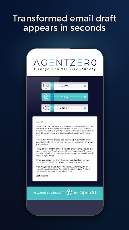 De ultieme e-mailassistent voor drukke mensen. AgentZero is 's werelds eerste voice-to-email-app die gebruikmaakt van Generative AI en GPT-4 om uw gesproken dictaat binnen enkele seconden om te zetten in professionele concept-e-mails. Kies uit verschillende e-mailstijlen, waaronder formeel, semi-formeel, overtuigend, instructief, waarderend of gemoedelijk. AgentZero bespaart u tijd, helpt u de juiste woorden te vinden en corrigeert automatisch uw grammatica en syntaxis. Alle concept-e-mails worden in uw inbox opgeslagen, zodat ze gemakkelijk kunnen worden verzonden. Stel bovendien herinneringen in die in je inbox verschijnen, zodat je nooit een belangrijke taak of afspraak vergeet. Ervaar vandaag de magie van AgentZero en maak uw dag vrij. Dicteer uw gedachten en zorg dat u binnen enkele seconden een professionele concept-e-mail klaar hebt om te verzenden. Download AgentZero nu!