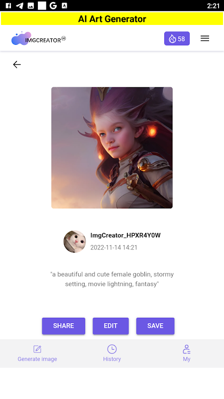 Generate AI Art in 3 simple steps, 1. Write a prompt in the text box or let app generate one for you, 2. Select Category and Style and 3. Click Create and wait for you AI image.