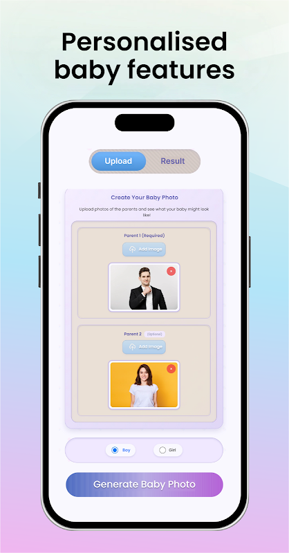 Maak unieke babyfoto's en ontdek het uiterlijk van uw toekomstige kinderen met onze slimme gezichtsgenerator. Upload foto's van beide ouders en laat kunstmatige intelligentie realistische babybeelden creëren.