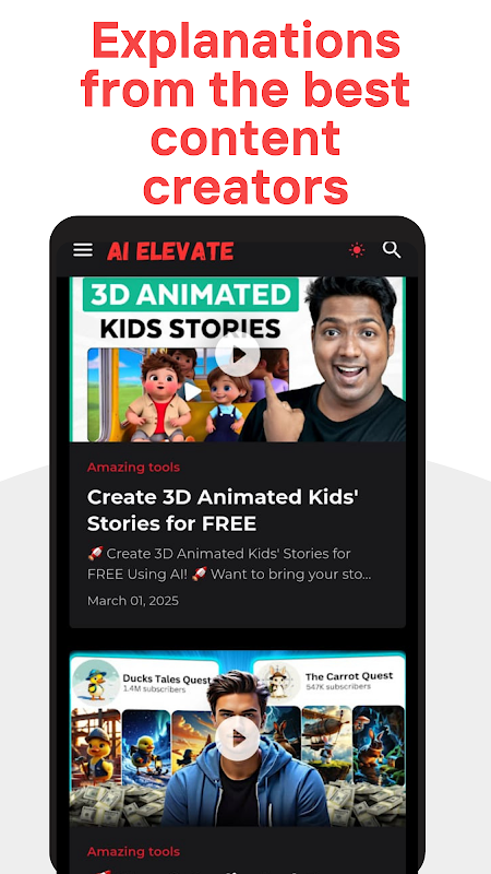 AI Elevate is niet alleen een educatieve app; het is een uitgebreid platform dat u toegang geeft tot hoogwaardige leermodules die een breed scala aan AI-onderwerpen bestrijken. Met diverse inhoud, waaronder artikelen, geschreven tutorials en educatieve video's, ontvangt u diepgaande lessen die complexe AI-concepten eenvoudig en gemakkelijk te begrijpen maken. Wat de app onderscheidt, zijn de tutorials op expertniveau van topprofessionals en YouTube-beïnvloeders die gespecialiseerd zijn in AI.