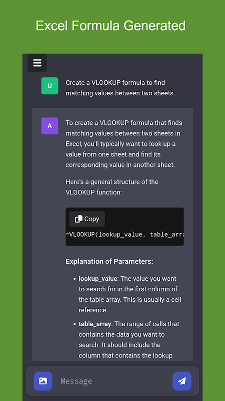 Werken met Excel-formules kan een uitdaging zijn, vooral als het om complexe berekeningen gaat. Met deze app hoeft u niet langer functies te onthouden of urenlang fouten op te lossen. Voer gewoon uw vereisten in en laat AI de formule voor u genereren.