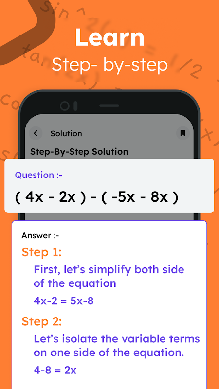 Met de AI Math Solver: Easy AI Math-app kun je eenvoudig alle moeilijke en ingewikkelde wiskundige problemen oplossen. Deze innovatieve applicatie is intuïtief en gebruiksvriendelijk ontworpen en biedt snelle en nauwkeurige oplossingen voor een breed scala aan wiskundige vergelijkingen en problemen. Met de AI Math Solver: Easy AI Math kunnen gebruikers moeiteloos complexe wiskundige concepten in diverse wiskundige problemen aanpakken. De app biedt een naadloze en interactieve interface waarmee gebruikers vergelijkingen kunnen invoeren door te typen, handschriftherkenning te gebruiken of zelfs afbeeldingen van handgeschreven vergelijkingen vast te leggen.