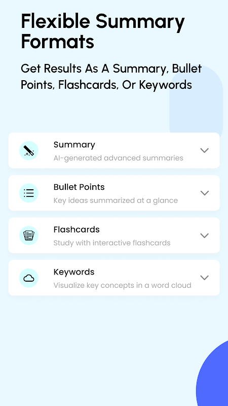 📝 Meerdere uitvoerformaten – Kies samenvatting, opsommingstekens, flashcards of trefwoorden