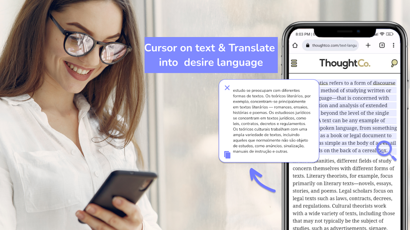 AI-vertaler - chatvertaling fungeert als een brug, waardoor een succesvolle dialoog en begrip mogelijk wordt. AI-vertaler - chatvertaler-app heeft een zwevende knop om een cursor over schermtekst te slepen en naar een andere taal te vertalen.