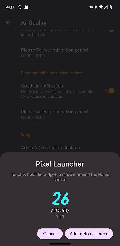 Dit geeft de luchtkwaliteitindex weer die is gedetecteerd door het dichtstbijzijnde meetstation. En volg uw geschiedenis van de AQI-geschiedenis van uw omgeving, zodat u de kwaliteit van de lucht waaraan u dagelijks wordt blootgesteld, intuïtiever kunt begrijpen. Koester uw gezondheid. Een herinnering om buitensporten te suggereren wanneer lucht van hoge kwaliteit wordt gedetecteerd. Wanneer de luchtkwaliteit slecht of zeer slecht is, wordt aanbevolen om niet uit te gaan als een waarschuwing wordt gedetecteerd als de beweging van de gebruiker wordt gedetecteerd.