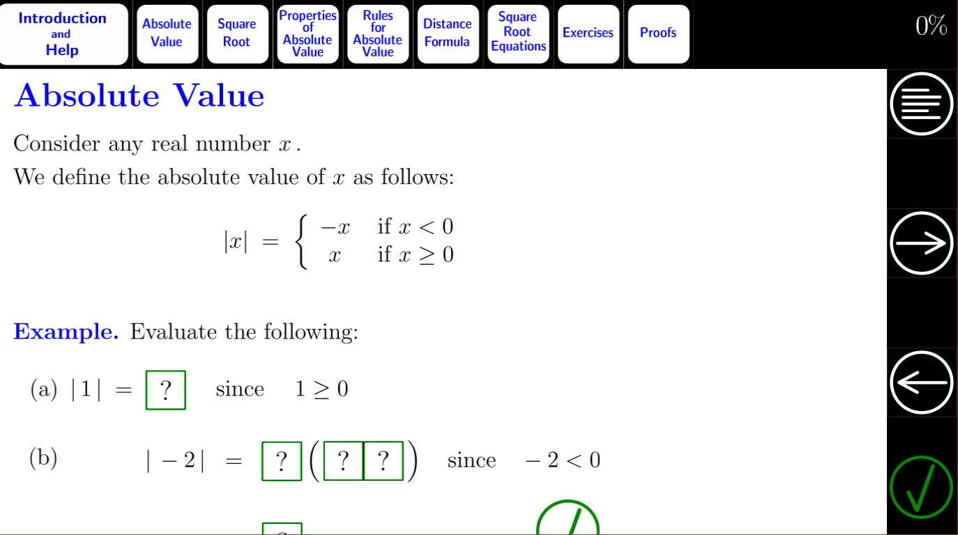 Interactieve wiskunde-tutorial voor absolute waarde en vierkantswortel