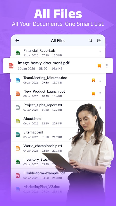 Open PDF-, Word-, Excel-, PPT- en alle andere bestanden met één slimme documentviewer.