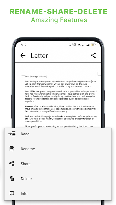 Met deze app kun je eenvoudig allerlei documentformaten lezen en bewerken, waaronder RTF, PDF, DOC, DOCX, XLS, XLSX, CSV, PPT, PPTX, PPS en PPSX. Hier zijn enkele van de belangrijkste kenmerken en functies van deze app: