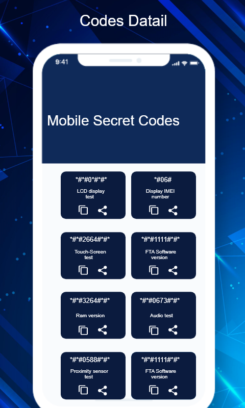 Veel mensen gebruiken mobiele telefoons 📱 maar ze zijn zich niet bewust van de geweldige functies die erin verborgen zijn. Het lijkt moeilijk om deze feiten op uw apparaat te leren kennen, maar nu niet meer, installeer gewoon deze geweldige app voor alle mobiele geheime codes 2022 - telefooncodes! Maak kennis met verborgen functies van Android en IPhone, zoals IMEI-controle of meer. Er zijn geen extra protocollen nodig om codes in uw telefoon te kiezen, alleen kopiëren en plakken.