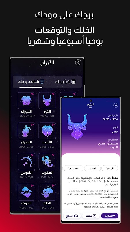 De app biedt ook een boeiende ervaring met trending social media-content en leuke functies zoals dagelijkse, wekelijkse en maandelijkse horoscoopvideo's, allemaal binnen een aanpasbaar persoonlijk profiel. Een breed scala aan content die aansluit bij jouw interesses: