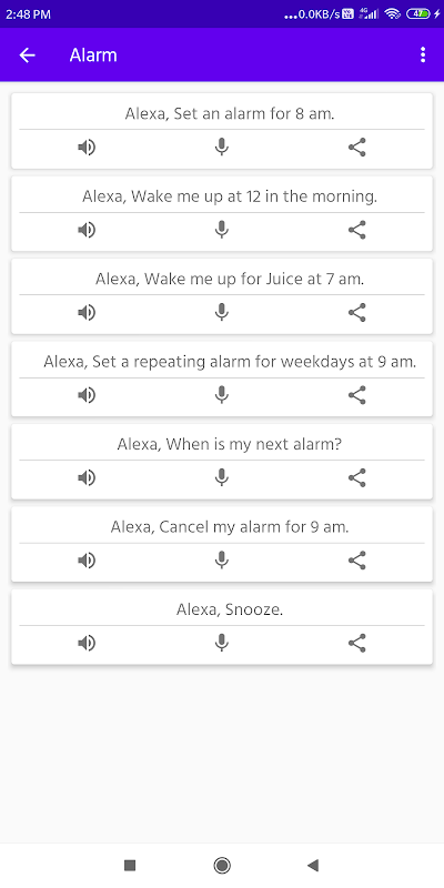 Deze app biedt een volledige lijst met spraakopdrachten voor Amazon Alexa Mobile- en Echo Home-apparaten, slimme luidsprekers die worden geactiveerd door de speciale zin Alexa. Alle spraakopdrachten zijn onderverdeeld in meerdere categorieën.
