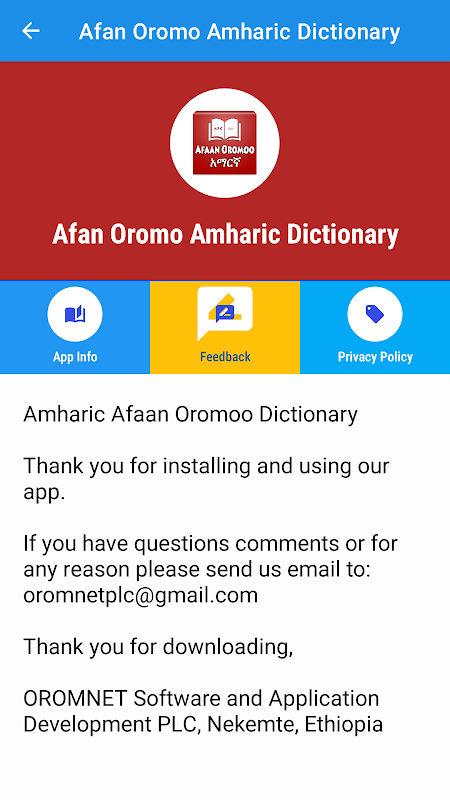 Dit is een basis Afaan Oromo Amhaars woordenboek dat zich richt op dagelijkse communicatie en woordenschat. Het heeft Afaan Oromoo-woorden met hun equivalente Amhaars vertaling, en vice versa. U kunt het woordenboek schrijven en doorzoeken met behulp van het ingebouwde Amhaars-toetsenbord in de app.