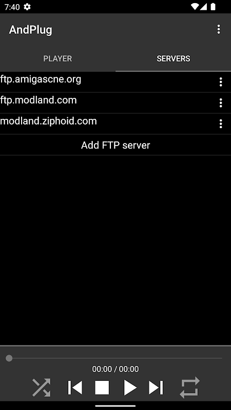 AndPlug speelt muziek af, oorspronkelijk gemaakt voor het AdLib (OPL2) audiobord, met behulp van de AdPlug-geluidsspelerbibliotheek. Inclusief FTP-client voor het downloaden van nummers en ondersteuning voor M3U-afspeellijsten.