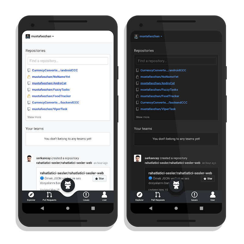 AndroCat is an unofficial GitHub client for Android phones and provides to GitHub user interface to users like how they used to. It aims to give traditional GitHub experience on mobile. Basically you can use all functionality of GitHub with this app. Like view/edit/search repositories, users, gists, issues and pull requests, your home page, started repositories, people you follow, people who follows you and so on.