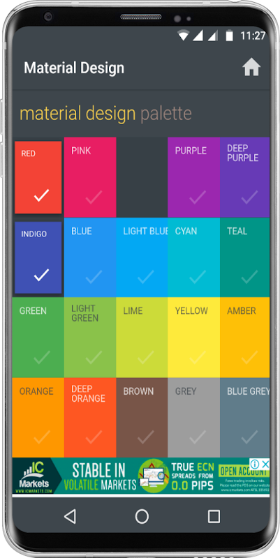 Includes primary colors and accent that can be used for illustration or to develop your brand colors. They were designed to work in harmony with each other. The color palette begins with primary colors and fills the spectrum to create a palette that is usable for Android, Web, and iOS. Google suggests using the "500" color tone as the primary color in your application and the other colors as color accents.