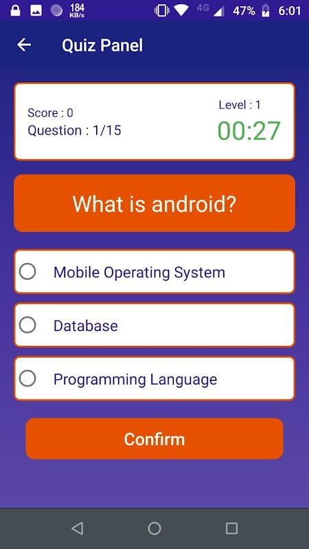In deze sectie kunnen gebruikers hun kennis testen op niveau en hun voortgang volgen. In de Android Quiz-sectie kunt u Testniveau kiezen door op de spinner te klikken. Er zijn drie testniveaus beschikbaar: niveau 1, niveau 2 en 3. Elk testniveau bestaat uit in totaal 15 meerkeuzevragen en bevat een afteltimer voor elke vraag die binnen 30 seconden moet worden beantwoord. Voor elk juist antwoord wordt de score met één verhoogd en dezelfde score wordt bijgewerkt in de beoordelingsbalk.