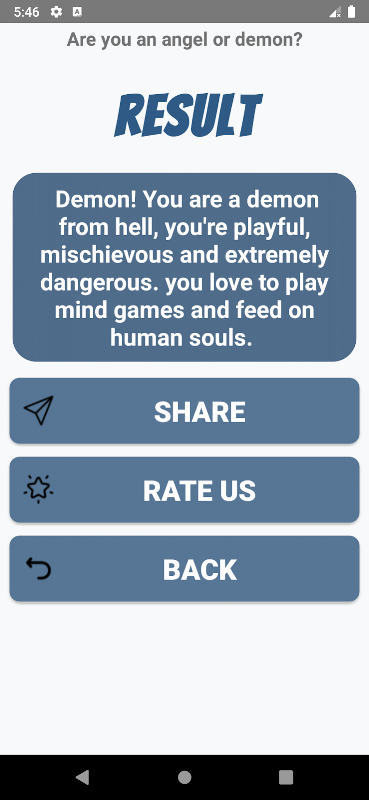 Gebruik deze leuke quiz van tijd tot tijd, want het kan uw resultaat veranderen. en stuur het naar alle vrienden en familie, doe de duivel en engelen quiz om erachter te komen of je een engel of een duivel bent.