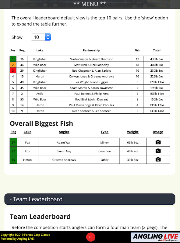 Angling LIVE is een scoresysteem dat is ontworpen om 100% live te zijn. Elke vis wordt toegevoegd aan het systeem tijdens het weegproces, dus er is geen vertraging voor updates.
