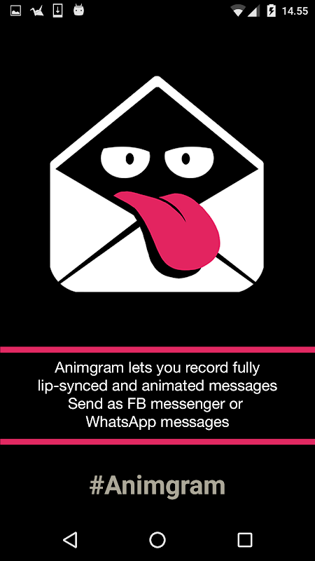 Met Animgram kun je volledig lip-gesynchroniseerde, geanimeerde berichten maken en ze verzenden en ontvangen met Facebook Messenger en WhatApp.