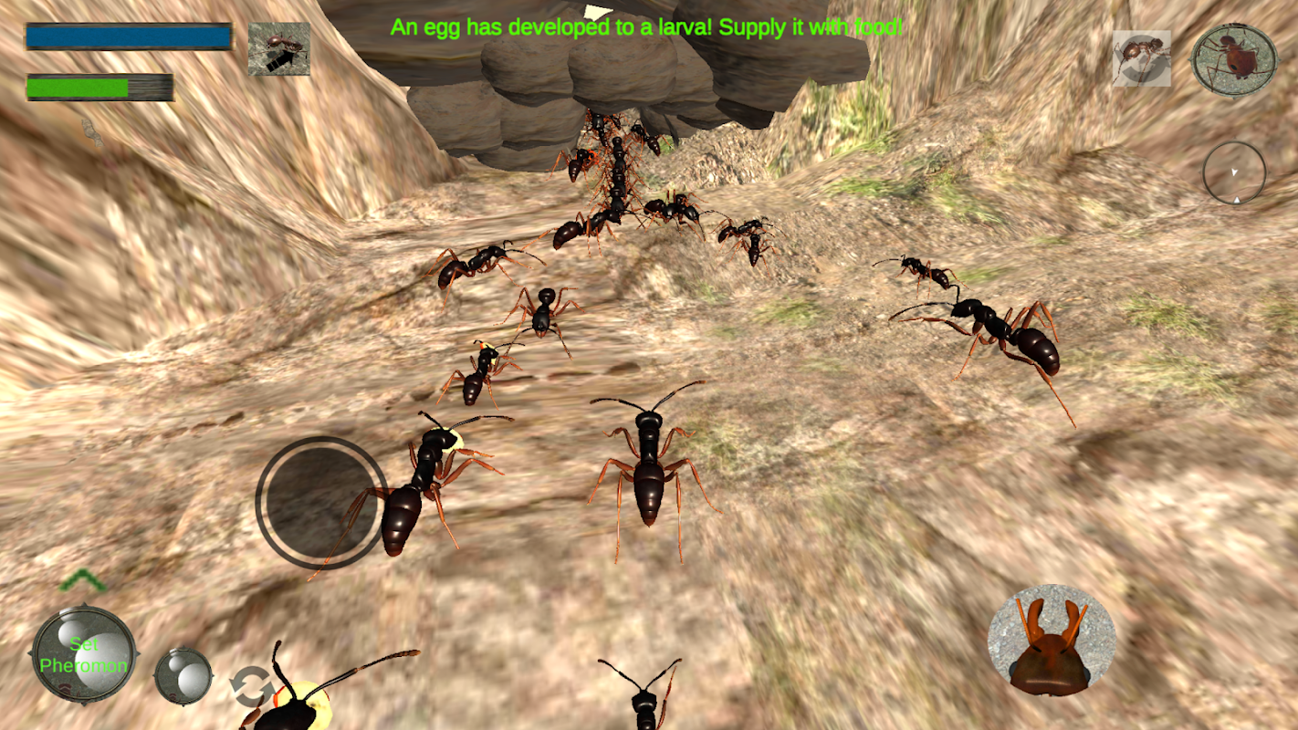 Zoek naar voedselbronnen om de mierenkoningin en de larven te voeden om ze te verpoppen en in een nieuwe mier te transformeren. Je kunt feromoonpaden maken om andere mieren aan te trekken of de mieren gewoon vragen om je te volgen.
