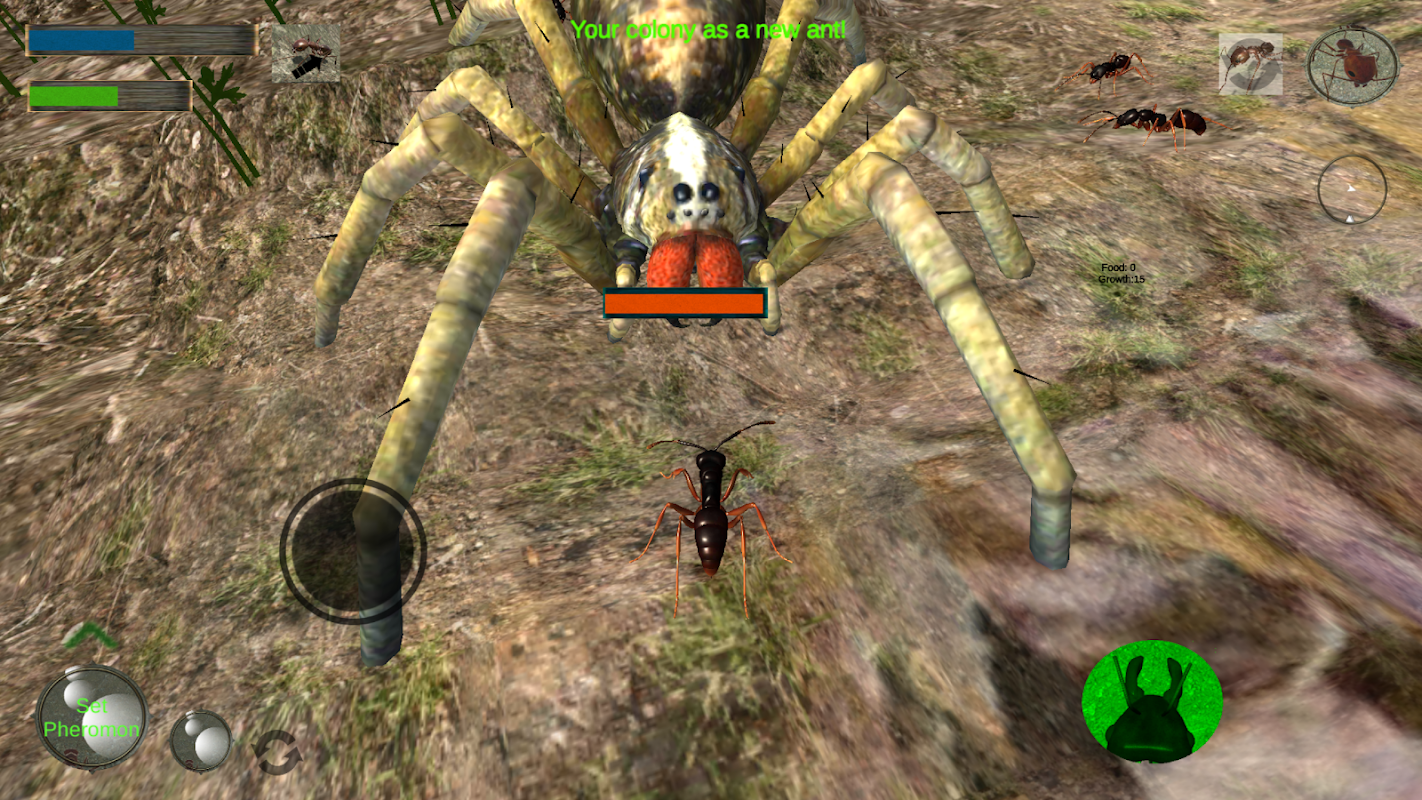 Voer aanvallen uit om andere insecten te overweldigen met de kracht van de zwerm en krijg eiwit voor de mierenlarven. Je moet mierengevechten plannen tegen vijandige insecten zoals enorme schorpioenen, spinnen of bidsprinkhanen. Krijg oorlog met die wezens door de kracht van vele soldatenmieren. Maak verbluffende mierenpaden met feromonen om ondersteuning te krijgen van de solidere mieren of werkmieren, rooi tunnels om de mierenheuvel te vergroten.