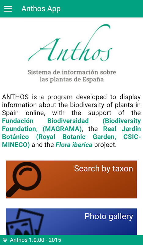 The Anthos project celebrates 15 years of operation on the internet (www.anthos.es) with the support of the Fundación Biodiversidad of the Spsanish Ministry of Agriculture, Food and Environment. Anthos is a derivative product of the Flora iberica (www.floraiberica.es) project, which is funded through the National Spanish Program of Development of Scientific and Excellence Technical Research of the Ministry of Economy and Competitiveness (CGL2014-52787-C3-1-P) and belongs to the Real Jardín Botánico (CSIC) and the universities of Cordoba, Seville and Salamanca.