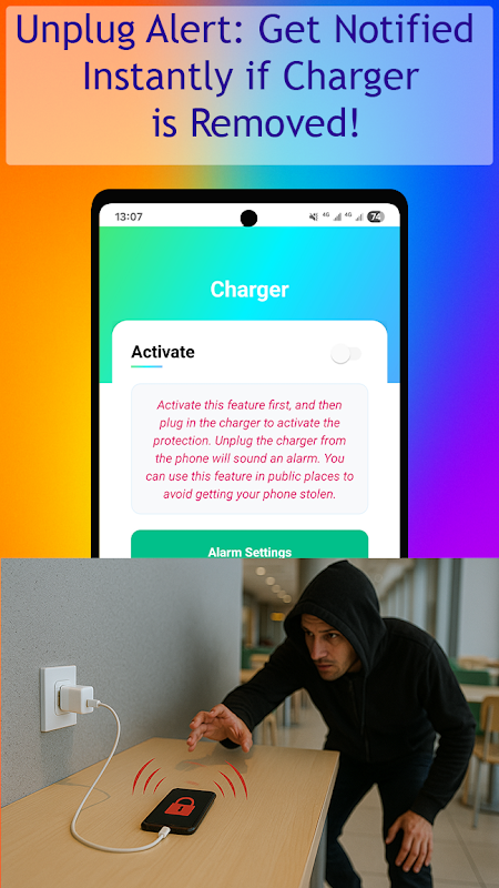 Veiligheid van uw apparaat tijdens het opladen: Maakt u zich zorgen over het achterlaten van uw telefoon bij een openbaar laadstation of bureau? Met het alarm voor het verwijderen van de oplader weet u direct of iemand uw telefoon zonder toestemming loskoppelt.