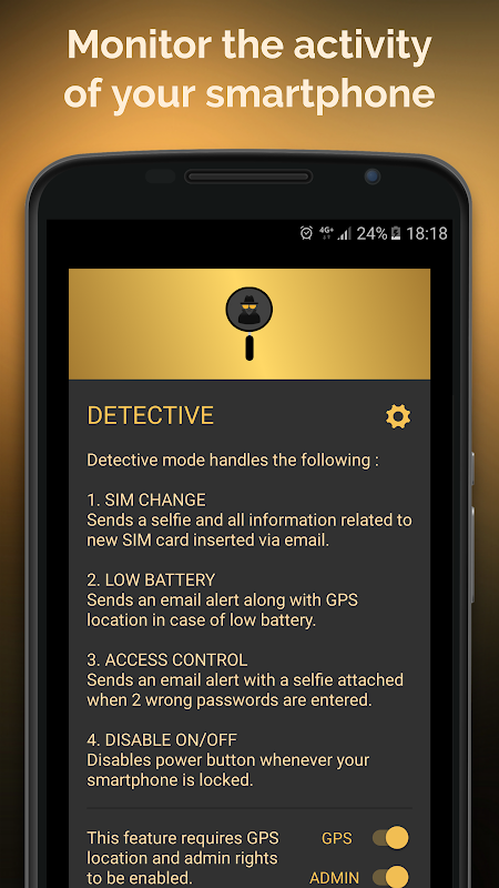 You can also rely on detective mode to monitor the activity of your smartphone at any time and make difficult for the thief to disable or uninstall Antitheft Security.