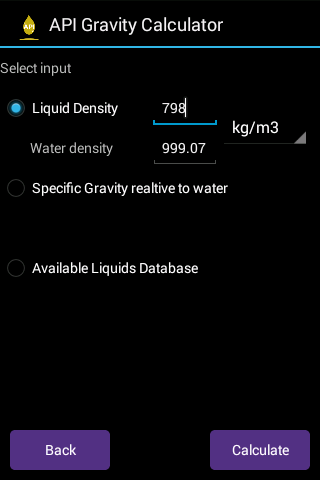 + Berekening van de API-zwaartekracht uit Vloeistofdichtheid of soortelijk gewicht of een voorgeladen database met vloeistoffen.
