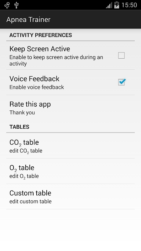 Deze applicatie laat je instellen u eigenaar co2 of o2 tafels of gebruik standaard Ones. U kunt ook uw eigen aangepaste tabellen.