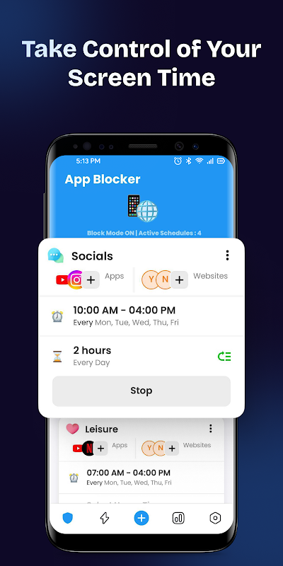 - Aanpasbare app-blokkering: kies welke apps u wilt blokkeren of beperken. Of het nu gaat om games, sociale media of andere tijdverspillers, u heeft de volledige controle om te beslissen wat u wanneer blokkeert. Dit maakt app blocker een van de meest flexibele app-blokkeer- en restrictie-app-tools die beschikbaar zijn.