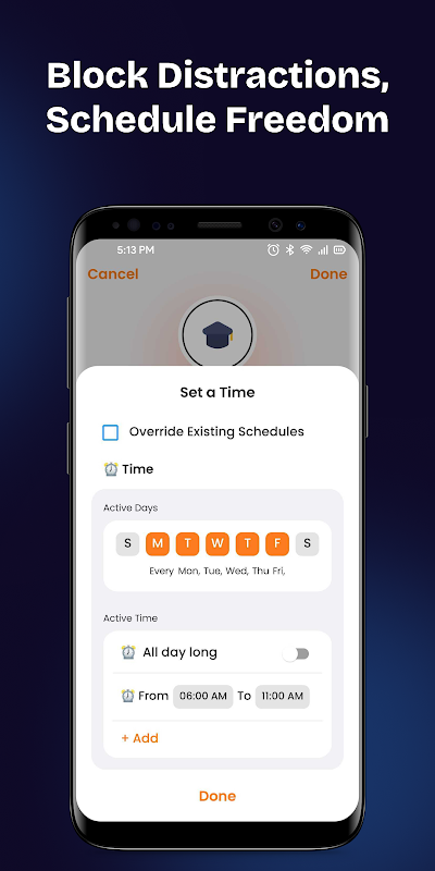 - Geplande blokkering: Plan specifieke tijden en dagen om geselecteerde apps en websites automatisch te blokkeren. Wilt u Facebook op Chrome blokkeren tijdens werkuren? Gebruik onze Google Chrome-tool voor het blokkeren van sites om grenzen af te dwingen. Maak aangepaste app-regels voor de schermtijdlimiet voor verschillende delen van uw dag.