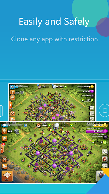 App Cloner is an amazing software for users to run multiple accounts at the same time on a single device, while messages and data of your different accounts are in seperated parallel space. App Cloner is compatible with most android apps, such as WhatsApp, Facebook, Messenger, Line, Snapchat,Twitter, Instagram, Skype and most Games.
