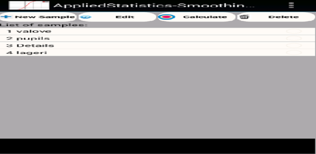 De app is ontworpen om steekproeven van willekeurige variabelen op te slaan (bewerkt, verwijderd, hernoemd) om hun statistische basiskenmerken te berekenen als de: -gemiddelde waarde; - standaardafwijking; - scheefheid en kurtosis; - om betrouwbaarheidsintervallen van de gemiddelde waarde te berekenen; - variantie en standaarddeviatie; - controleer of de steekproef van normaal of uniform verdeelde willekeurige variabele is met behulp van het criterium van Pearson; - controleer of de steekproef een normale, uniform en exponentieel verdeelde willekeurige variabele is met behulp van het criterium van Kolmogorov-Smirnov; - en nul scheefheid en kurtosis; - bepaald histogram van monster- en afgevlakte histogrammen.