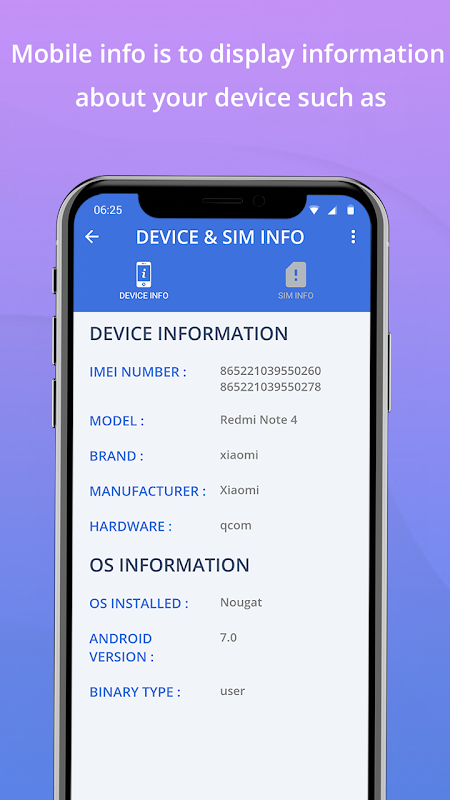 - Toont telefooninformatie en siminformatie.