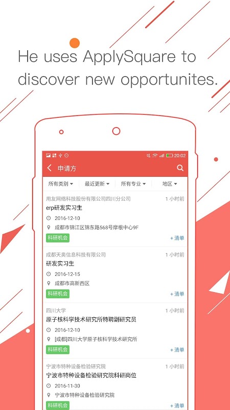 ApplySquare is a mobile internet company that provide services for college students around the world based on its mobile app. It enables college students to discover、apply、manage opportunities and communicate with others to improve themselves among their academic path. Its the world’s largest database includes 3000+ universities, 30,000+ programs, 2000+ cases,300,000+ admission results and 56 majors. Q&A forum is a place for students、professors and education agencies to share knowledge about academy and campus life. ApplySqaure’s mission is to help build positive interactions between students and their universities.