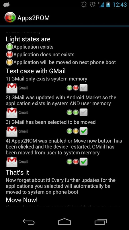- On some devices (mostly stock ROM neo-rooted), the auto-move feature might not work so you can try the "Move now" functionality which is compatible with more devices.