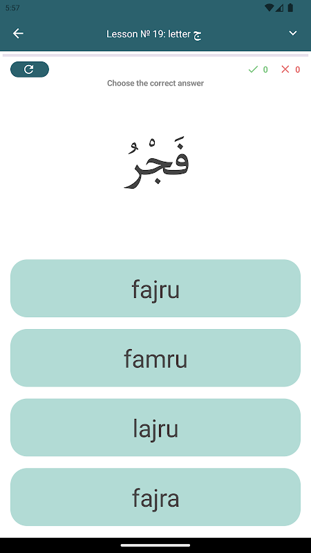 Om het leren en begrijpen te vergemakkelijken, zijn de lessen gerangschikt in toenemende complexiteit, van eenvoudig tot moeilijk. U moet dus vanaf de eerste les beginnen met leren en naarmate u de stof onder de knie heeft, doorgaan naar de volgende les. Doorloop eerst de hele les door de onderstaande knoppen heen en weer te bewegen, te luisteren naar de uitspraak van alle woorden en, indien nodig, naar de transliteratie te kijken. Schakel vervolgens de uitspraak en transliteratie uit en lees de hele les. Nadat je elk woord afzonderlijk hebt gelezen, controleer je jezelf door op de scoreknop te klikken (onderaan het scherm). Slaag daarna voor de test (de knop bevindt zich rechtsboven) en ga, in geval van succesvolle passage, naar de volgende les. Als zich problemen voordoen, kunt u de les opnieuw doorlopen. Door dit programma te volgen, zult u gemakkelijk de Arabische letters onder de knie krijgen en in het Arabisch leren lezen.