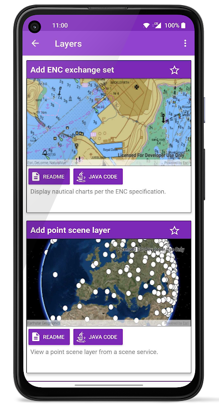Bekijk de voorbeelden om uit de eerste hand te ervaren welke functionaliteit u kunt gebruiken in uw eigen apps op maat. Blader door de code achter elk voorbeeld vanuit de app en op onze github-pagina (https://github.com/Esri/arcgis-runtime-samples-android) en kijk hoe gemakkelijk het is om de SDK te gebruiken.