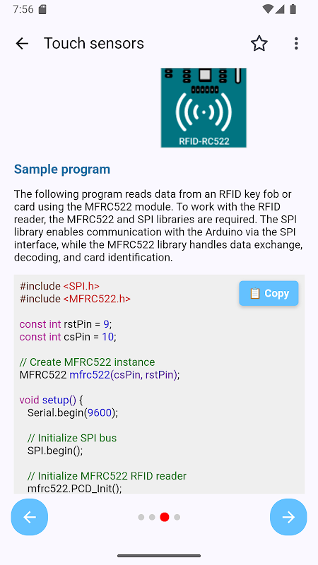 De app bevat een uitgebreide collectie elektronische componenten, analoge en digitale sensoren en externe modules die met Arduino worden gebruikt. Elk item wordt geleverd met: