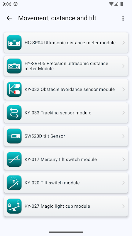 De app bevat een uitgebreide verzameling elektronische componenten, analoge en digitale sensoren en externe modules die met Arduino gebruikt kunnen worden. Elk item wordt geleverd met: